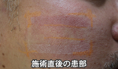 傷あと部分は肌が硬くなっているため、その軟化と減少させることができ、伴い肌の盛り上がりや凹みを平坦化してきます。表層では色素を作る細胞を含む表皮が誘導され色素欠損部位をカバ―させます。