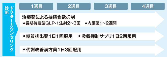 食欲抑制ホルモンGLP-1注射を主軸に、下記の治療内容から患者様の体型や体質・生活スタイルに合わせた組合わせを医師がご提案し治療を行います。